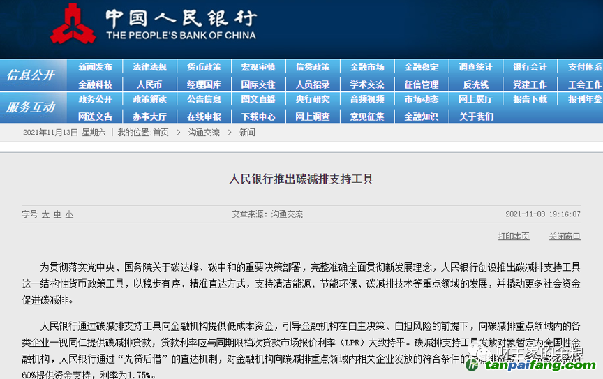 11月8日,中國(guó)人民銀行發(fā)布消息,推出碳減排支持工具。 禸嫆@唻洎:狆國(guó)湠棑倣茭昜蛧 τāńpāīfāńɡ.cōm