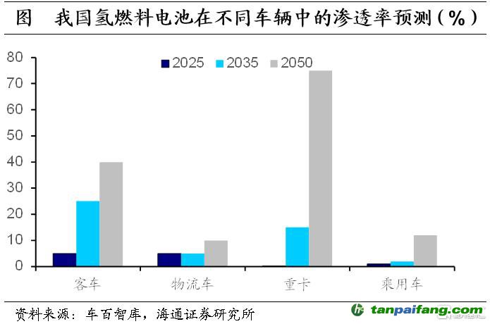氫燃料電池在交通運(yùn)輸行業(yè)中的應(yīng)用是未來的重要增長點(diǎn)。目前我國燃料電池汽車占新能源汽車銷量的比重最高也不超過0.4%。其中,截至2020年8月,燃料電池車主要以物流車和客車為主,乘用車占比僅為0.1%,且主要用于租賃。根據(jù)車百智庫的預(yù)測,氫燃料電池汽車保有量將在2025、2035和2050年分別達(dá)到10萬、100萬和3000萬輛,年均增速約為25.6%,主要應(yīng)用于重卡、客車等大型車輛中,在乘用車中的滲透率也將提高到12%。