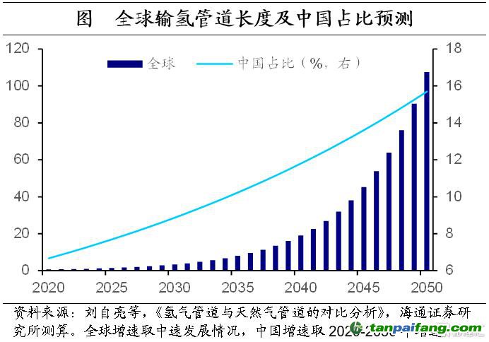 在儲運(yùn)的基礎(chǔ)設(shè)施上,氫氣管網(wǎng)建設(shè)有較大的發(fā)展空間。工業(yè)氫氣運(yùn)輸主要以管道形式為主,低壓管道運(yùn)氫適合大規(guī)模、長距離的情況,在未來有極大的需求。全球在2020年共建成輸氫管道6000公里,其中,中國僅有400公里,占比為6.7%。而根據(jù)劉自亮等的研究,預(yù)計在中速發(fā)展的情況下,到2050年全球?qū)⒔ǔ砷L距離和短距離輸氫管道7.5萬和100萬公里,年均增速約為18.9%。中國預(yù)計到2030年將建成氫氣管道3000公里,年均增速為22.3%,較全球增長更快。