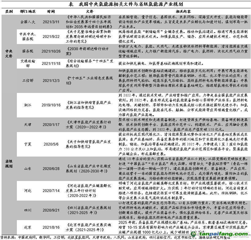 2020年9月22日,在聯(lián)合國大會一般性辯論上向全世界宣布了我國2030年前碳達(dá)峰、2060年前碳中和的目標(biāo),在踐行“雙碳”理念的過程中,發(fā)展氫能及相關(guān)產(chǎn)業(yè)、技術(shù)被多次提及。在2021年9月22日,在中央碳達(dá)峰、碳中和“1+N”政策體系中首個頂層設(shè)計文件《關(guān)于完整準(zhǔn)確全面貫徹新發(fā)展理念做好碳達(dá)峰碳中和工作的意見》,著重提到了“統(tǒng)籌推進(jìn)氫能‘制儲輸用’全鏈條發(fā)展”,“推動加氫站建設(shè)”,“推進(jìn)可再生能源制氫等低碳前沿技術(shù)攻關(guān)”,“加強(qiáng)氫能生產(chǎn)、儲存、應(yīng)用關(guān)鍵技術(shù)研發(fā)、示范和規(guī)模化應(yīng)用”等氫能源產(chǎn)業(yè)的重要舉措。與此同時,各地政府也將氫能領(lǐng)域作為實(shí)現(xiàn)“雙碳”目標(biāo)的重要抓手,截至11月中旬,我國有20多個省級市、40多個地級市推出了60多個氫能產(chǎn)業(yè)規(guī)劃。