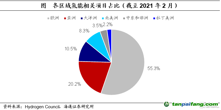 目前我國也是全球發(fā)展氫能速度較快的國家之一,在截至2021年初全球投資的氫能項(xiàng)目中,我國占比較高。據(jù)國際氫能協(xié)會統(tǒng)計,全球氫能產(chǎn)業(yè)鏈上已建成、在建和規(guī)劃項(xiàng)目共228個,主要分布在歐洲、澳大利亞、亞洲、中東、智利等國家和地區(qū)。從地域分布來看,預(yù)計歐洲的投資份額最大(約45%),其次是亞洲,而中國占亞洲總投資的50%左右,居首位。 本文@內(nèi)/容/來/自:中-國-碳^排-放-交易&*網(wǎng)-tan pai fang . com