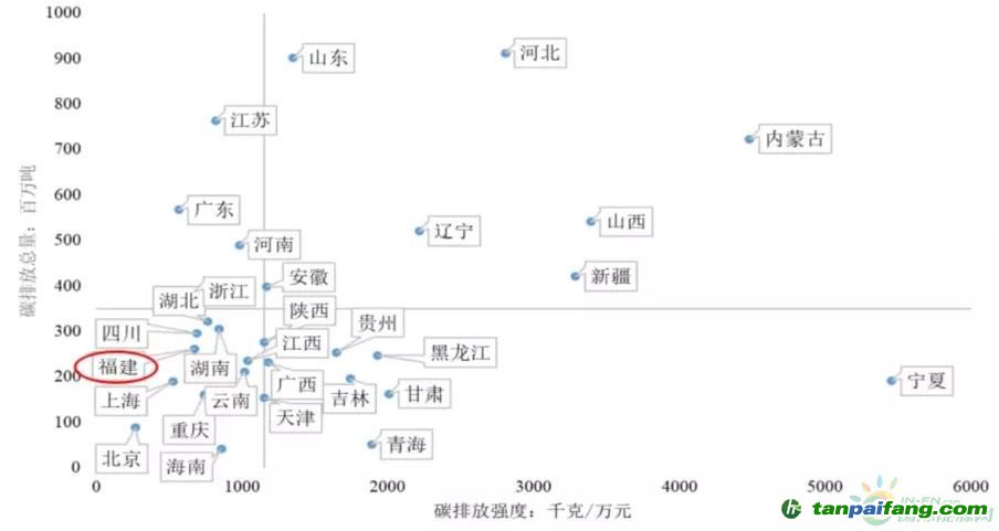 ◆總量差異:河北、山東、江蘇、內(nèi)蒙古、廣東排名前五,排放總量全部超過5億噸,產(chǎn)業(yè)結(jié)構(gòu)偏重、能源結(jié)構(gòu)偏煤,為域外提供大量高載能產(chǎn)品;福建全國排名16,排放總量為2.61億噸、低于全國平均水平。 本文@內(nèi)/容/來/自:中-國-碳^排-放-交易&*網(wǎng)-tan pai fang . com