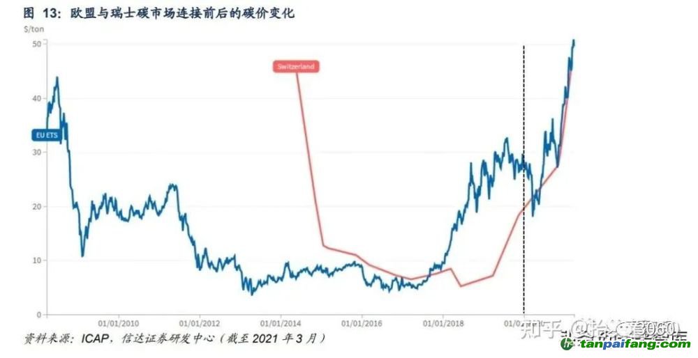 碳價(jià)相近國(guó)家的碳市場(chǎng)或?qū)⒅鸩竭B接。碳市場(chǎng)連接后碳價(jià)將趨同。邊際減排成本相近的碳市場(chǎng)連接,價(jià)格變化有限,對(duì)控排企業(yè)影響較小。瑞士碳市場(chǎng)于 2020 年與歐盟碳市場(chǎng)完成了連接,此后價(jià)格趨于一致。 本+文`內(nèi)/容/來/自:中-國(guó)-碳-排-放-網(wǎng)-tan pai fang . com
