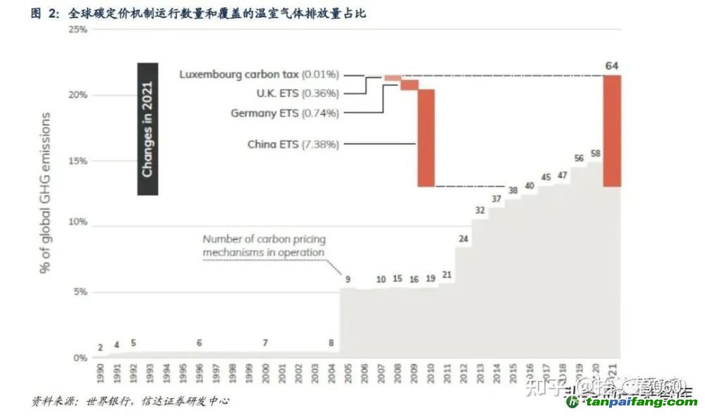 從全球來看,碳市場(chǎng)和碳稅均有較大范圍應(yīng)用。采用碳市場(chǎng)的有 1 個(gè)共同體、9 個(gè)國(guó)家和 20 個(gè)地區(qū),從覆蓋面看,2021 年運(yùn)行的碳定價(jià)機(jī)制(碳稅和碳市場(chǎng))數(shù)量達(dá)到 64 個(gè),覆蓋的溫室氣體排放量占全球溫室氣體排放總量的 21.5%。根據(jù)世界銀行統(tǒng)計(jì),2020 年運(yùn)行的碳定價(jià)機(jī)制數(shù)量為 58 個(gè),覆蓋全球 15.1%的溫室 氣體排放量。2021 年增量主要來自于中國(guó)全國(guó)碳排放權(quán)交易市場(chǎng)的建立。 本`文@內(nèi)-容-來-自;中_國(guó)_碳排0放_(tái)交-易=網(wǎng) t an pa ifa ng . c om