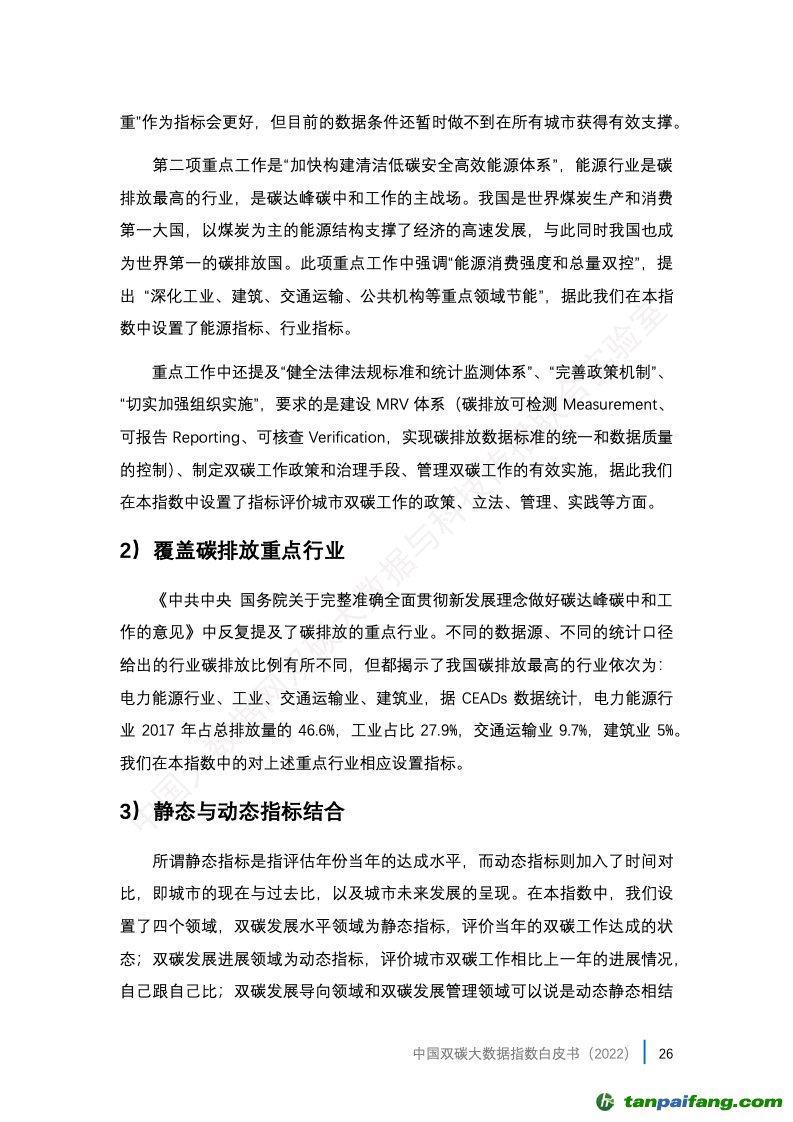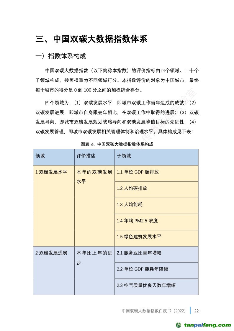 2、中國雙碳大數(shù)據(jù)指數(shù)體系。中國雙碳大數(shù)據(jù)指數(shù)(以下簡稱本指數(shù))的評價指標(biāo)由四個領(lǐng)域、二十個子領(lǐng)域構(gòu)成,按照權(quán)重為不同領(lǐng)域打分。本指數(shù)評價的對象為中國城市,最終每個城市的得分是0到100分之間的加權(quán)綜合得分。四個領(lǐng)域?yàn)椋?/font>(1)雙碳發(fā)展水平,即城市雙碳工作當(dāng)年達(dá)成的成就;(2) 雙碳發(fā)展進(jìn)展,即城市自身跟去年相比,在雙碳工作中取得的進(jìn)展;(3)雙碳發(fā)展導(dǎo)向,即城市雙碳發(fā)展規(guī)劃戰(zhàn)略導(dǎo)向和雙碳發(fā)展峰值目標(biāo)的先進(jìn)性;(4) 雙碳發(fā)展管理,即城市雙碳發(fā)展相關(guān)管理體制和治理水平。具體構(gòu)成見后文。 內(nèi)/容/來/自:中-國-碳-排-放*交…易-網(wǎng)-tan pai fang . com