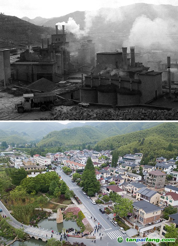 拼版照片:上圖為浙江省湖州市安吉縣天荒坪鎮(zhèn)余村二十世紀(jì)八十年代的資料照片;下圖為2018年4月24日,游客在整修一新的余村游覽(新華社記者 翁忻旸 攝)。新華社發(fā)