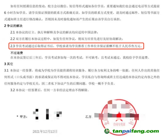 一些培訓(xùn)機(jī)構(gòu)也利用了學(xué)員的這種心理。這家培訓(xùn)機(jī)構(gòu)在合同中專(zhuān)門(mén)注明:學(xué)員考試通過(guò)取得證書(shū)后,學(xué)校承諾為學(xué)員推薦工作單位,并保證薪酬不低于人民幣3萬(wàn)元。