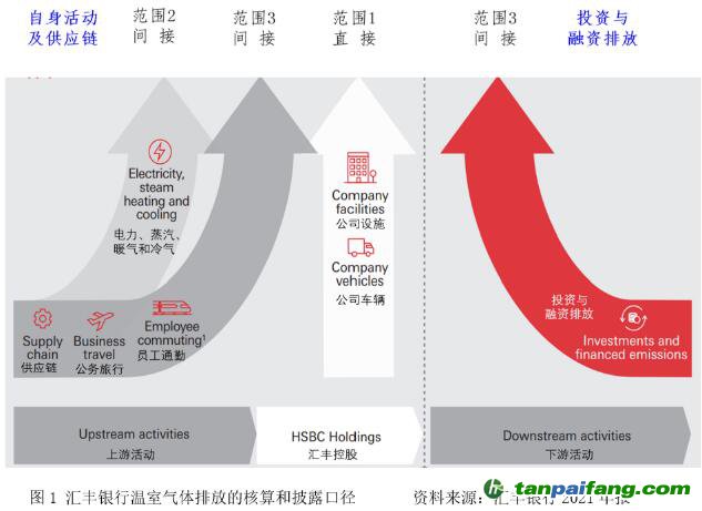 作為氣候信息披露的提供者,金融機(jī)構(gòu)在溫室氣體排放方面的核算和披露口徑遠(yuǎn)大于企業(yè),既要核算和披露金融機(jī)構(gòu)自身經(jīng)營(yíng)業(yè)務(wù)產(chǎn)生的溫室氣體排放,即經(jīng)營(yíng)排放(Operational Emissions),又要核算和披露其投資和融資組合產(chǎn)生的溫室氣體排放,即融資排放(Financed Emissions)。匯豐銀行在其2021年報(bào)用圖1高度概括了溫室氣體排放的核算和披露口徑,在金融業(yè)頗具代表性。