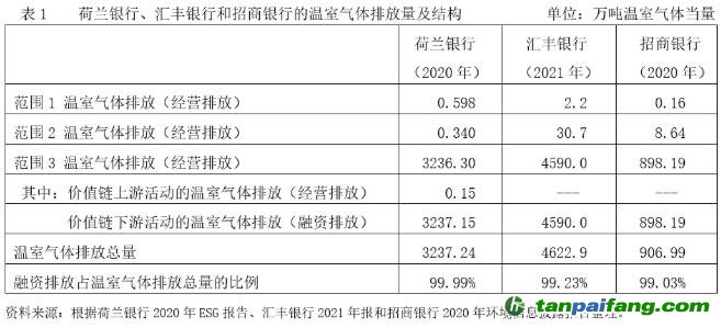 CDP 2020)。表1列示了荷蘭銀行、匯豐銀行和招商銀行的溫室氣體排放結(jié)構(gòu)。從中可以看出,融資排放在這三家銀行的溫室氣體排放總量中所占比例均超過(guò)99%,經(jīng)營(yíng)性排放所占比例微不足道,幾乎可以忽略不計(jì)。