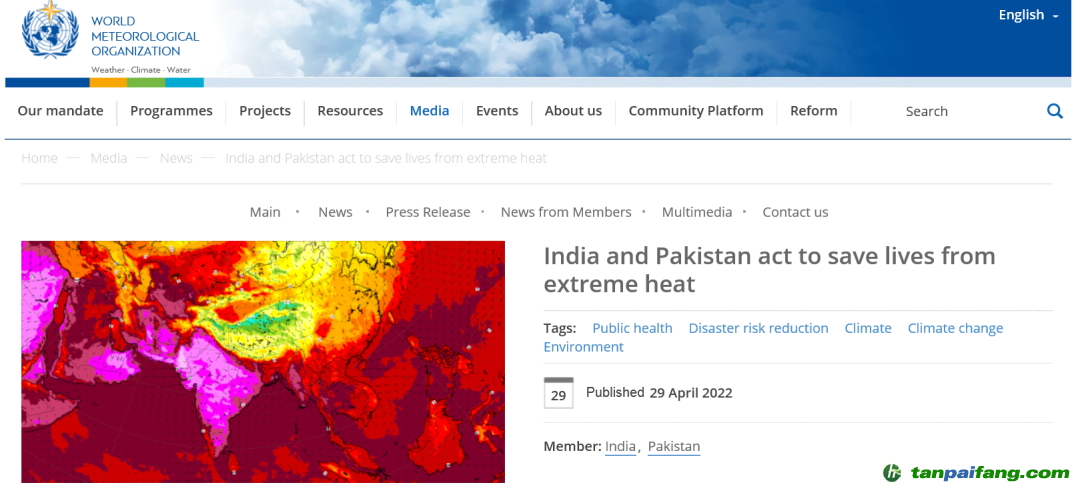 4月29日,世界氣象組織發(fā)文稱,酷熱正席卷印度和巴基斯坦的大部分地區(qū),影響著這個世界上人口最稠密地區(qū)之一的數(shù)億人。 本+文+內.容.來.自:中`國`碳`排*放*交*易^網(wǎng) t a np ai fan g.com