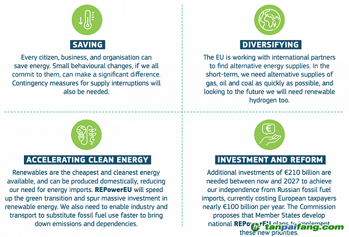 歐盟將從節(jié)能、能源供應(yīng)多樣化、加速可再生能源建設(shè)、改革融資渠道等四個(gè)方面多管齊下,以完成能源綠色轉(zhuǎn)型。 本@文$內(nèi).容.來.自:中`國`碳`排*放^交*易^網(wǎng) t a np ai fan g.c om