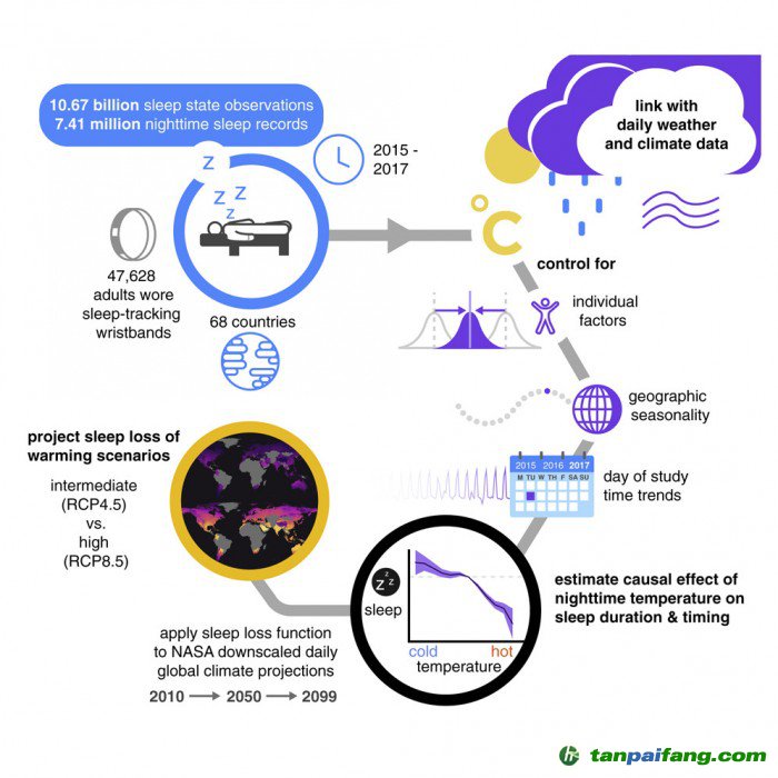 觀察性研究和調(diào)查數(shù)據(jù)先前已經(jīng)表明可能是這樣的情況,發(fā)現(xiàn)夜間溫度的上升和自我報(bào)告的睡眠不佳的夜晚之間存在聯(lián)系。為了尋找更具體的證據(jù),這項(xiàng)新研究的作者通過68個(gè)國(guó)家47000多名成年人佩戴的基于加速度計(jì)的追蹤腕帶收集了全球睡眠數(shù)據(jù),涵蓋了除南極洲以外的所有大陸。