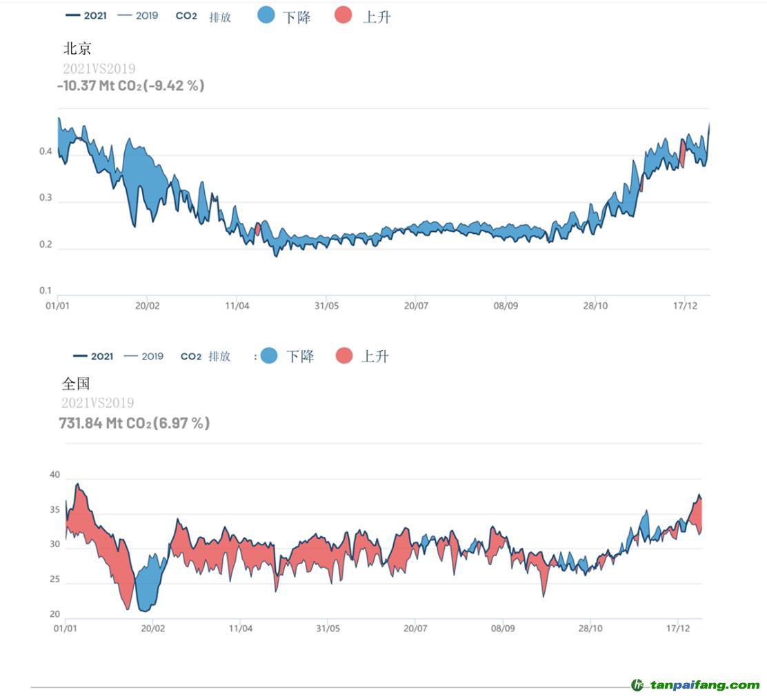 2019-2021年期間,北京繼續(xù)在大氣污染治理上不斷突破。2021年,北京PM2.5濃度為33μg/m³,首次達(dá)到國家二級標(biāo)準(zhǔn),PM2.5濃度同比下降13%。與污染物濃度同步下降的,還有二氧化碳排放量。根據(jù)全球?qū)崟r(shí)碳數(shù)據(jù),與2019年相比,2021年北京全年的二氧化碳排放量幾乎都處于下降狀態(tài),全年下降約9.42%,而同期全國的碳排放量整體呈上升趨勢。2021年北京GDP總值突破4萬億元,在全國城市中排名第二,同比增長8.5%,而碳排放強(qiáng)度約為0.28噸/萬元,較2019年下降約20%,名副其實(shí)地實(shí)現(xiàn)了低碳高質(zhì)量發(fā)展。