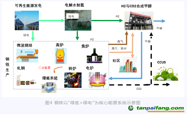 在未來建設(shè)以新能源為主體的新型電力系統(tǒng)背景下,鋼鐵行業(yè)能源系統(tǒng)應(yīng)以電能替代和氫能替代為主線,綠電和綠氫的組合可以通用在鋼鐵生產(chǎn)的各個環(huán)節(jié)。因此,構(gòu)建以“綠電+綠氫”為核心的能源系統(tǒng),以甲醇作為優(yōu)質(zhì)載體,加上氫冶金技術(shù)的創(chuàng)新與應(yīng)用,使鋼鐵擺脫對化石能源的依賴,從源頭上解決碳排放問題,是實現(xiàn)低碳甚至“零碳”排放的最佳途徑。同時依靠“互聯(lián)網(wǎng)+”加快能源數(shù)字化、智能化升級,提高能源系統(tǒng)靈活感知及高效運行能力,最終實現(xiàn)能源系統(tǒng)聯(lián)通共享。