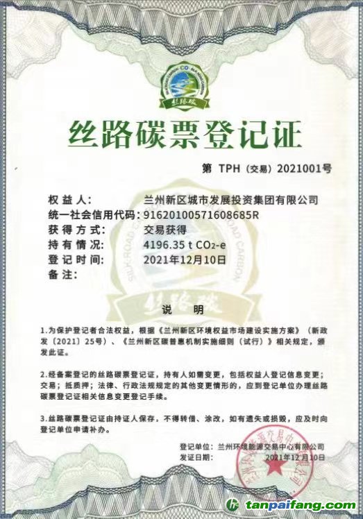絲路碳票登記證(受訪者供圖) 本`文@內(nèi)-容-來(lái)-自;中_國(guó)_碳排0放_(tái)交-易=網(wǎng) t an pa ifa ng . c om