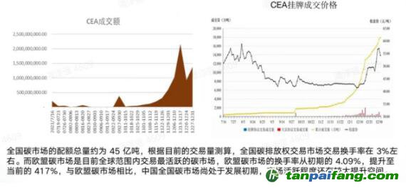 我國去年的碳排放交易量大約在17億噸左右,成交金額在76億元上下,聽上去比較少。其背后的原因有兩點,其一是機構(gòu)還沒能加入碳市場,這部分交易量是潛在的,其二是市場剛剛開放,企業(yè)以履約為主,以投資目的做碳交易的企業(yè)很少,因而換手率只有13%,這也導(dǎo)致了交易量較低。中國碳價格在開盤時是48元,到今天,碳價漲到60元左右,始終保持增長態(tài)勢。