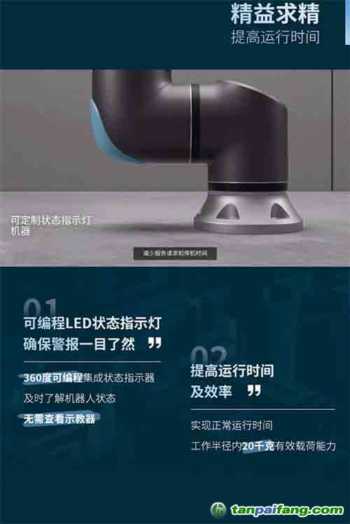 經(jīng)過風(fēng)險評估,ur機器人是不必設(shè)置安全圍欄的,旁邊協(xié)同工作的員工不用擔(dān)心會有危險,而且URe系列協(xié)作機械臂表面光滑,關(guān)節(jié)處無尖角,這樣就避免了員工在操作時可能出現(xiàn)的傷害,在經(jīng)過德國技術(shù)檢驗協(xié)會的安全認(rèn)證后,隨即投入市場。6月新發(fā)布的UR20可編程LED狀態(tài)指示燈釋放警報信號,無需查看示教器,就可以將機器人狀態(tài)一目了然,提高工作場所安全性。