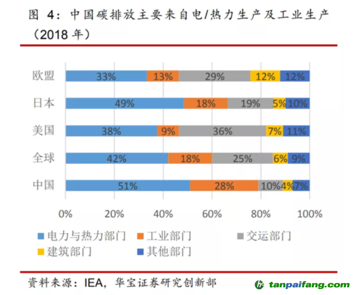 電熱力生產(chǎn)及工業(yè)集中用煤、交通領(lǐng)域大量耗油是導(dǎo)致中國(guó)碳排放量較大的主因。根據(jù)英國(guó)BP的2019年數(shù)據(jù),中國(guó)93%的碳排放來(lái)源于化石燃料的使用,其中68%來(lái)自于固體燃料如煤炭,23%來(lái)自于液體燃料如石油等,9%來(lái)自于氣體燃料如天然氣等。