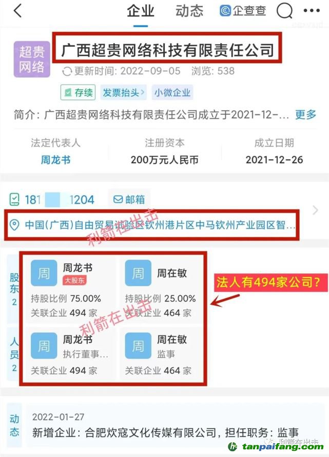 今天不是談這個(gè)項(xiàng)目的后續(xù),主要是講“碳中和”項(xiàng)目牽連出的許許多多的虛假的公司正在注銷跑路之中,很多公司就在今天(10月8日)以后將永遠(yuǎn)消失!在企查查中查“廣西超貴網(wǎng)絡(luò)科技有限責(zé)任公司”,公司成立于2021年12月26日,法人周龍書,名下顯示有494家公司,股東周在敏名下有464家公司,對(duì)于有實(shí)力的老板,我們認(rèn)為就是有再多的公司也不足為奇,但是這家公司的法人與股東旗下的公司是反常的!請(qǐng)跟著利箭的腳步,捂住小心臟往下看。