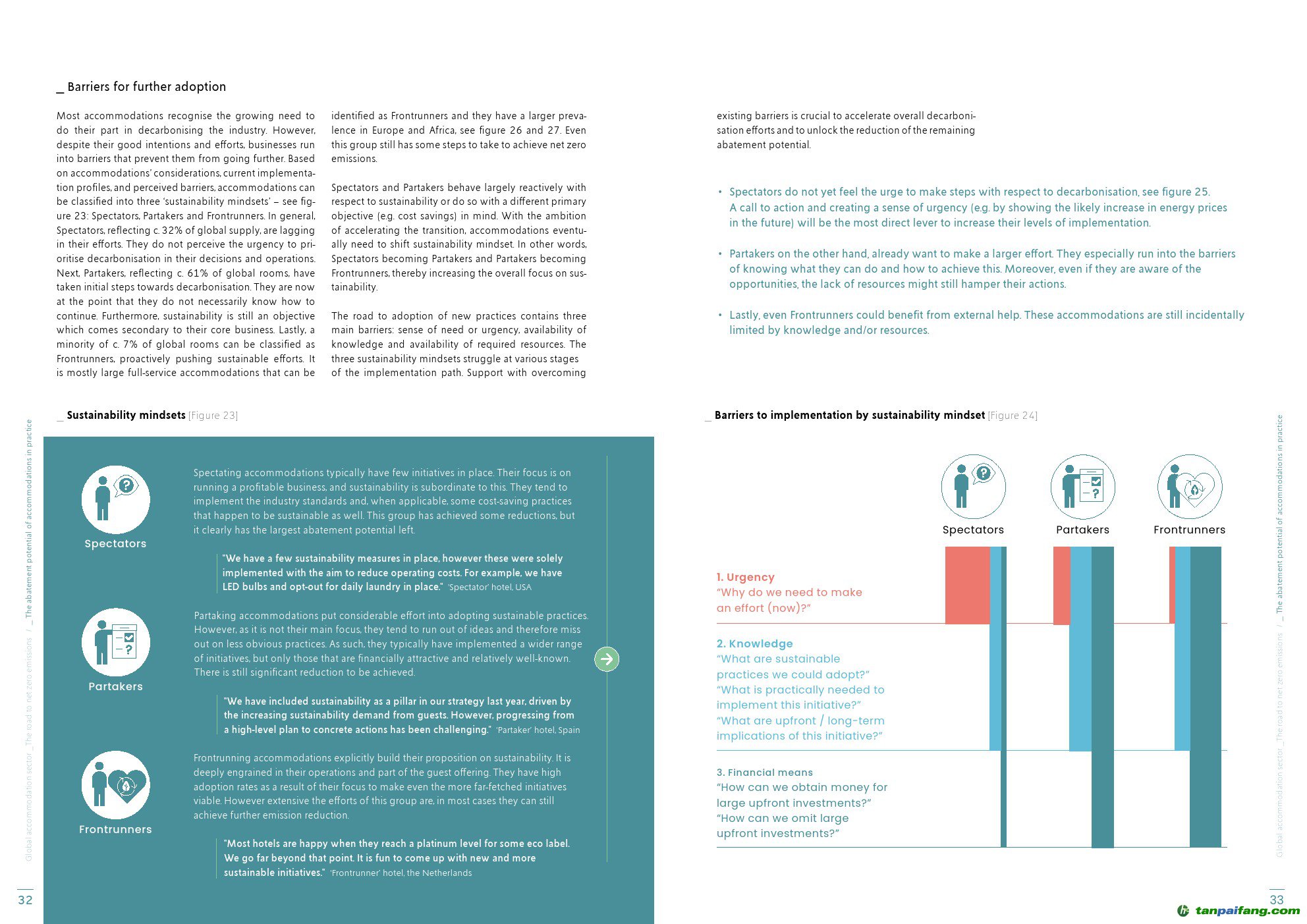 報(bào)告確定了關(guān)于可持續(xù)發(fā)展的實(shí)施和重要性的三種適應(yīng)心態(tài)。 觀望者約占市場(chǎng)的 32%,并未積極追求可持續(xù)發(fā)展目標(biāo),迄今為止僅實(shí)施了標(biāo)準(zhǔn)行業(yè)舉措或僅出于節(jié)省成本的目的采取了行動(dòng)。 為這一細(xì)分市場(chǎng)營(yíng)造緊迫感,例如通過(guò)強(qiáng)調(diào)不作為的代價(jià),將是向前發(fā)展的重要推動(dòng)力。參與者約占 61%,他們希望采取行動(dòng),只要這不會(huì)對(duì)其住宿的吸引力產(chǎn)生負(fù)面影響。 最后同樣重要的是,領(lǐng)跑者約占市場(chǎng)供應(yīng)量的 7%。
