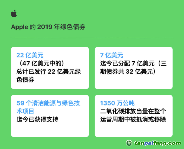 到目前為止,蘋果已從2019年47億綠色債券中撥款7億美元支持59個項(xiàng)目,包括中國清潔能源基金、為供應(yīng)商開發(fā)及分配清潔能源培訓(xùn)資源,以及在日本、越南和韓國的合作宣傳工作。 禸*嫆唻@洎:狆國湠棑倣茭昜蛧 τāńpāīfāńɡ.cōm