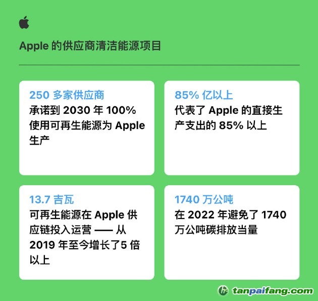 通過加入供應(yīng)商清潔能源計劃,蘋果公司的供應(yīng)商在全球各地展現(xiàn)出對提升可再生電力容量的需求。從2019 年至今,蘋果的全球供應(yīng)鏈投入運(yùn)營的可再生能源增加了5倍以上,共計13.7吉瓦。這避免了去年1740萬公噸碳排放當(dāng)量,相當(dāng)于一年內(nèi)減少380萬輛汽車在道路上行駛。 本文`內(nèi)-容-來-自;中_國_碳_交^易=網(wǎng) tan pa i fa ng . c om