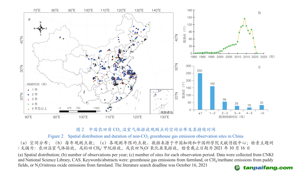 我國(guó)有關(guān)農(nóng)田生態(tài)系統(tǒng)的溫室氣體排放觀測(cè)研究始于20世紀(jì)80年代,隨著1992年通過(guò)的《聯(lián)合國(guó)氣候變化框架公約》于1994年3月21日起對(duì)中國(guó)生效,相關(guān)工作如雨后春筍一般迅速在全國(guó)各地展開(kāi)。筆者根據(jù)中國(guó)知網(wǎng)和中國(guó)科學(xué)院文獻(xiàn)情報(bào)中心的檢索結(jié)果發(fā)現(xiàn)(圖2):我國(guó)已進(jìn)行了覆蓋全國(guó)6大分區(qū)、85種作物、148個(gè)種植模式和545個(gè)監(jiān)測(cè)點(diǎn)的溫室氣體排放通量原位觀測(cè);每年觀測(cè)點(diǎn)數(shù)在2014年達(dá)到峰值,隨后急劇減少;絕大部分觀測(cè)點(diǎn)持續(xù)時(shí)間較短,5年以上的只有33個(gè)。這說(shuō)明我國(guó)田間原位觀測(cè)點(diǎn)由于科研項(xiàng)目的實(shí)際需求具有很大的波動(dòng)性和不確定性,一旦項(xiàng)目結(jié)題或試驗(yàn)結(jié)束,觀測(cè)點(diǎn)可能隨之棄用,導(dǎo)致我國(guó)相對(duì)缺乏穩(wěn)定且長(zhǎng)期有效的原位監(jiān)測(cè)平臺(tái)和通量觀測(cè)數(shù)據(jù)。