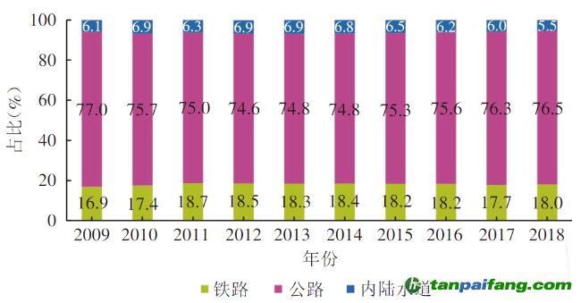 圖7 歐盟不同的貨運(yùn)方式占比(2009-2018年) 本+文內(nèi).容.來.自:中`國`碳`排*放*交*易^網(wǎng) ta np ai fan g.com