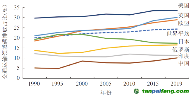 圖1 部分國家和地區(qū)交通運(yùn)輸領(lǐng)域碳排放占各自總碳排放的比例