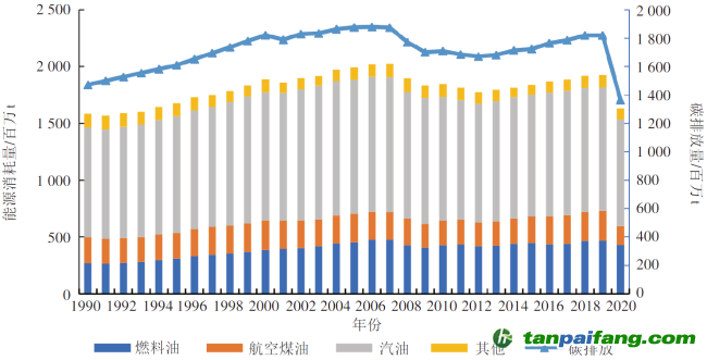 圖2 美國交通運(yùn)輸領(lǐng)域能耗量和碳排放量(1990-2020年) 本文+內(nèi)-容-來-自;中^國_碳+排.放_(tái)交^易=網(wǎng) t a n pa ifa ng .c om