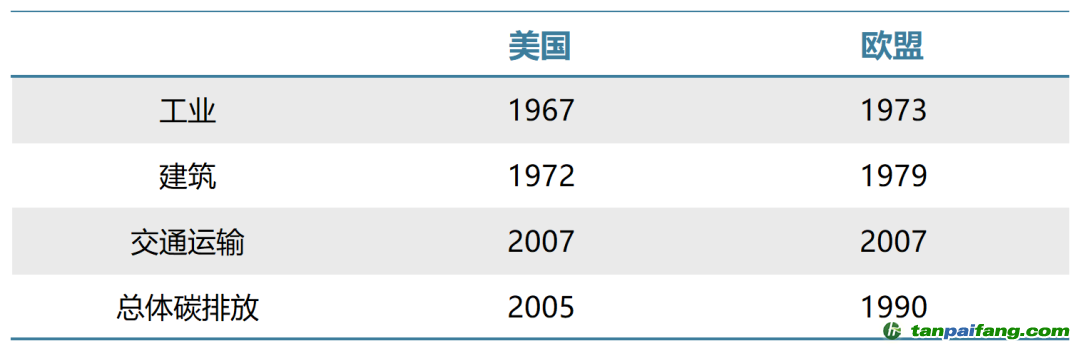 表1 美國和歐盟的工業(yè)、建筑、交通運(yùn)輸領(lǐng)域碳達(dá)峰年份