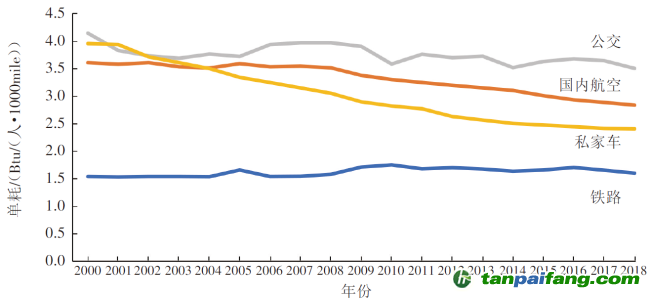 圖3 美國不同客運(yùn)方式單位能耗變化情況(2000-2018年)