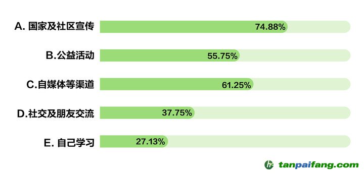 《綠色生活報(bào)告》調(diào)研了公眾低碳知識獲取渠道。報(bào)告顯示,國家及社區(qū)綠色低碳宣傳是各年齡階段公眾最主要了解、認(rèn)知低碳生活的途徑,總占比為74.88%;其次是自媒體等宣傳渠道,占比為61.25%。其中,23-35歲年齡段,通過社交媒體及自媒體獲取低碳知識占比最高,為67.05%。 內(nèi)/容/來/自:中-國/碳-排*放^交%易#網(wǎng)-tan p a i fang . com
