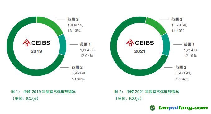 報(bào)告將2019年設(shè)為基準(zhǔn)年,并選取近三年中運(yùn)營活動(dòng)數(shù)據(jù)較為正常的2021年作為跟蹤評(píng)估年,全面評(píng)估和掌握學(xué)院溫室氣體排放情況。數(shù)據(jù)表明,2019年中歐五大校區(qū)溫室氣體排放總量為9,977.29 tCO2e,2021年溫室氣體排放總量為9,515.13 tCO2e。相較于2019年,2021 年中歐溫室氣體排放總量下降4.63%。 本文@內(nèi)/容/來/自:中-國-碳^排-放-交易&*網(wǎng)-tan pai fang . com