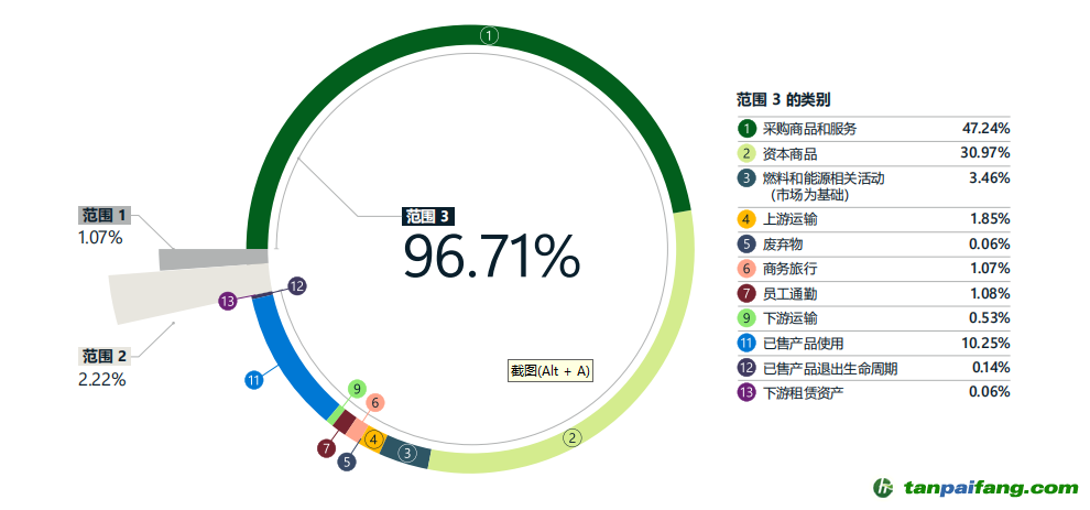微軟在基準(zhǔn)年份2020年的二氧化碳總排放為11444219噸,其中范圍一118100噸,范圍二456119噸,范圍三貢獻(xiàn)了最多的碳排放,高達(dá)10870000噸,主要來(lái)自于數(shù)以萬(wàn)計(jì)的供應(yīng)商(上游)以及數(shù)百萬(wàn)客戶(hù)對(duì)微軟產(chǎn)品的使用(下游)。