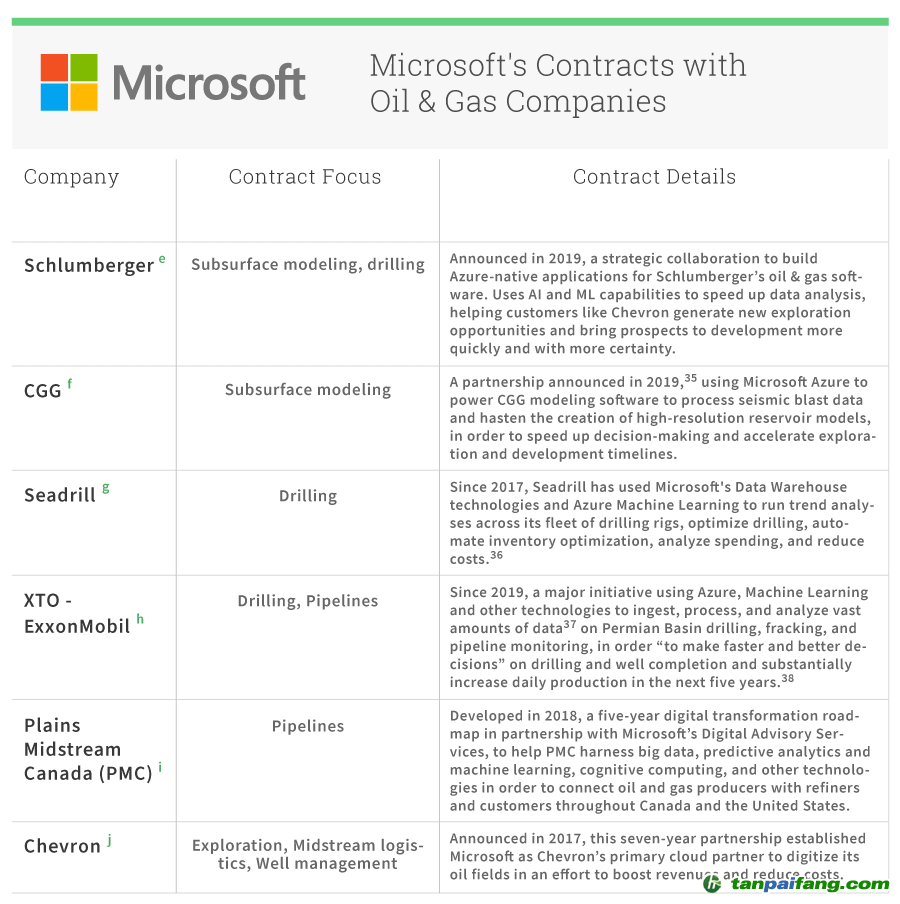 在油氣生產(chǎn)的每個(gè)階段都可以找到這些技術(shù)公司與油氣公司之間的合同,嚴(yán)重?fù)p害了像微軟、Google和Amazon這樣的公司所作的氣候承諾。