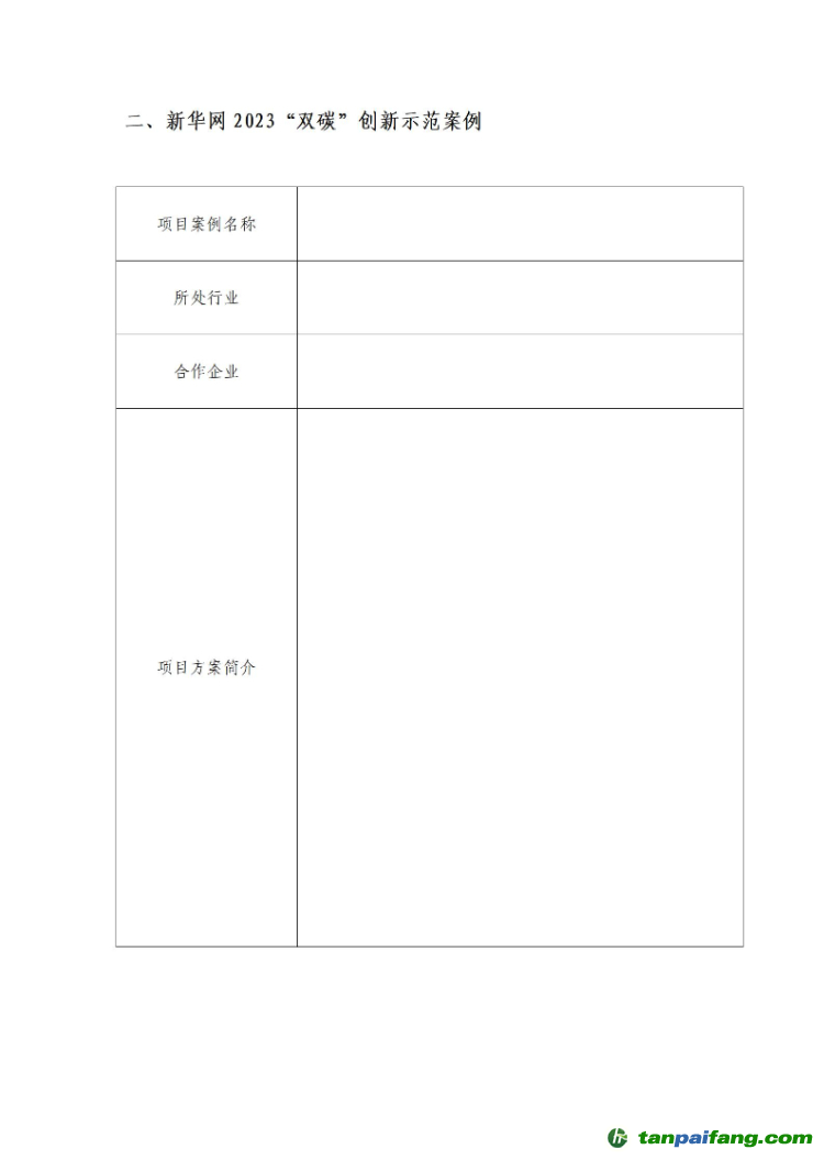 4、《新華網(wǎng)2023“雙碳”創(chuàng)新示范案例》須按照表格進(jìn)行填寫,案例情況敘述準(zhǔn)確、邏輯性強(qiáng)、具有較強(qiáng)可讀性(盡可能結(jié)合圖、表等形式)。 內(nèi).容.來(lái).自:中`國(guó)`碳#排*放*交*易^網(wǎng) t a np ai f an g.com