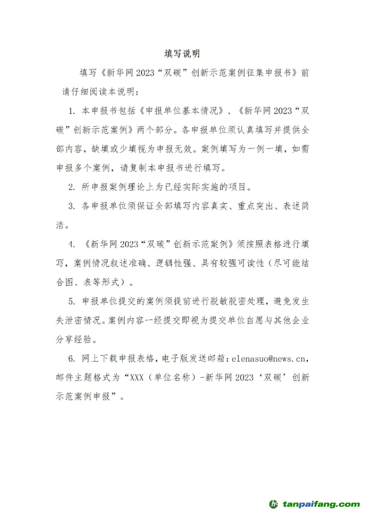 填寫《新華網(wǎng)2023“雙碳”創(chuàng)新示范案例征集申報(bào)書》(下載文件附后),并發(fā)送至郵箱:elenasuo@news.cn,有關(guān)圖片、媒體報(bào)道復(fù)印件等可作為附件同時(shí)發(fā)送。 內(nèi).容.來(lái).自:中`國(guó)`碳#排*放*交*易^網(wǎng) t a np ai f an g.com