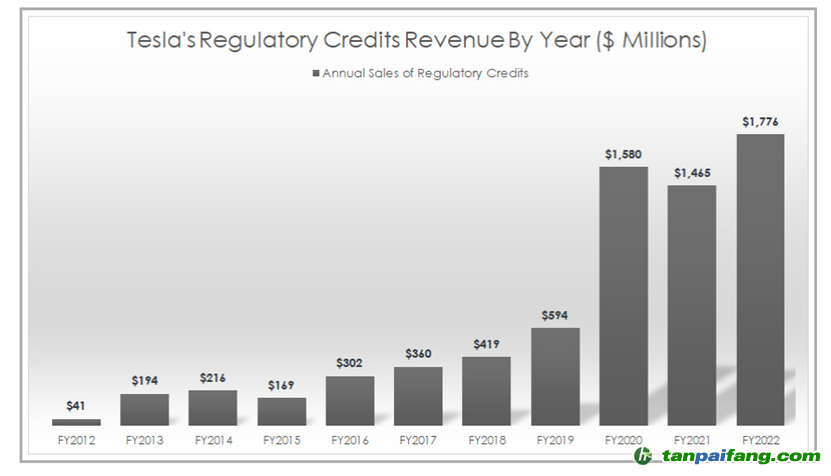 圖說:特斯拉每年從監(jiān)管信用額積分中獲得的收入。