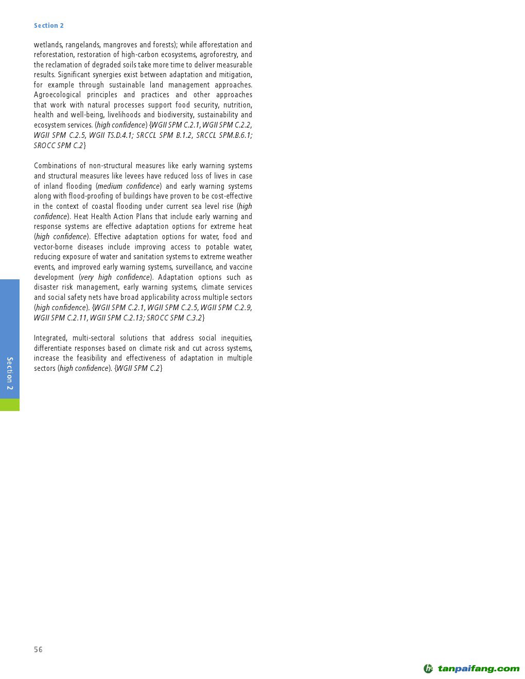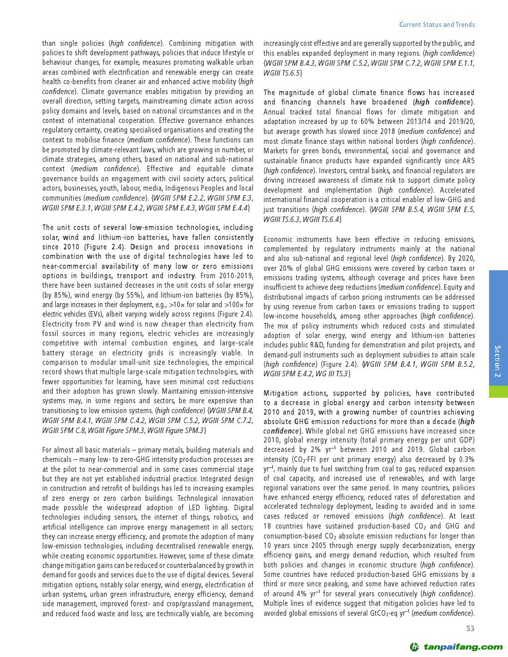 國際氣候協(xié)議、各國氣候行動(dòng)雄心的提高,以及公眾意識(shí)的提高,正在加速多個(gè)治理層面應(yīng)對(duì)氣候變化的努力。這有助于降低全球能源和碳強(qiáng)度,一些國家在十多年的時(shí)間里實(shí)現(xiàn)了溫室氣體減排。低排放技術(shù)正變得越來越便宜,能源、建筑、交通和工業(yè)領(lǐng)域現(xiàn)在有許多低排放或零排放的選擇。適應(yīng)規(guī)劃和實(shí)施進(jìn)展產(chǎn)生了多重效益,有效的適應(yīng)方案有可能減少氣候風(fēng)險(xiǎn)并促進(jìn)可持續(xù)發(fā)展。用于減緩和適應(yīng)的全球資金呈上升趨勢(shì),但仍未滿足需求。 本文`內(nèi)-容-來-自;中_國_碳_交^易=網(wǎng) tan pa i fa ng . c om