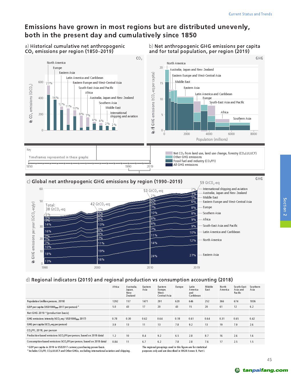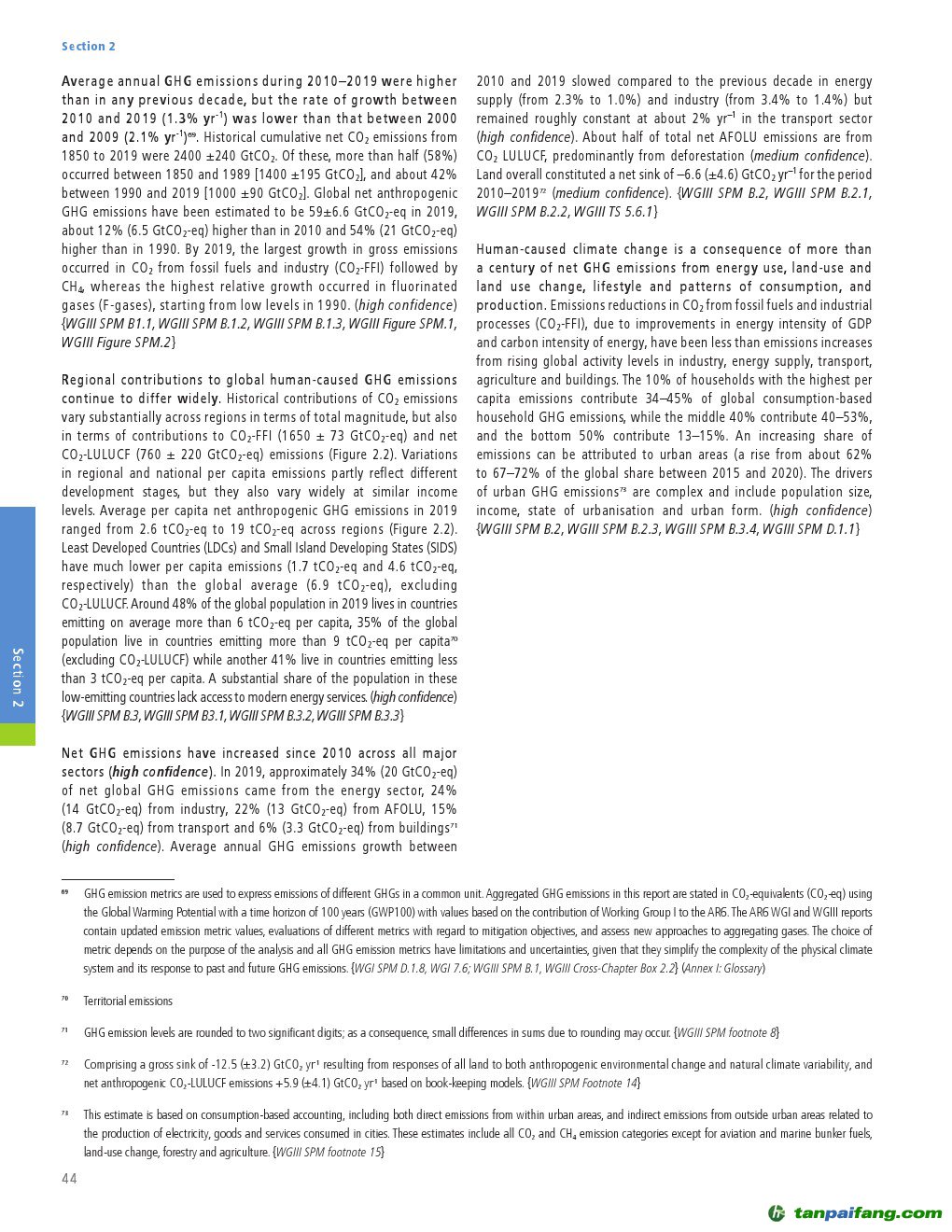 人類活動(dòng),主要是通過溫室氣體排放,已明確導(dǎo)致全球變暖,2011-2020年全球地表溫度比1850-1900年高出1.1°C。全球溫室氣體排放在2010-2019年期間持續(xù)增加。人為造成的氣候變化已經(jīng)導(dǎo)致全球每個(gè)地區(qū)的許多極端天氣和氣候。這對(duì)糧食和水安全、人類健康以及經(jīng)濟(jì)和社會(huì)造成了廣泛的不利影響,并對(duì)自然和人造成了相關(guān)損失和損害。歷史上對(duì)當(dāng)前氣候變化貢獻(xiàn)最小的脆弱社區(qū)受到的影響不成比例。