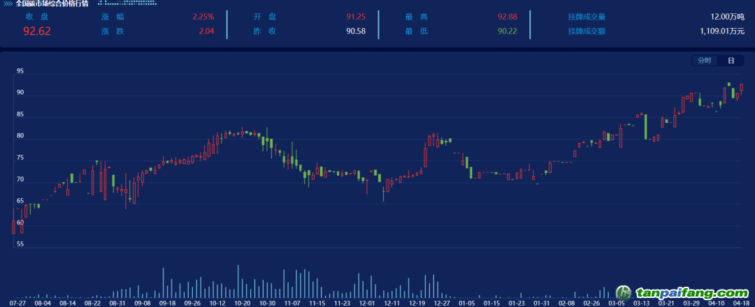 碳配額價(jià)格已經(jīng)漲至創(chuàng)紀(jì)錄的每噸92.63元人民幣。