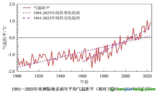 1901年至2023年,亞洲地表年平均氣溫和中國地表年平均氣溫均呈顯著上升趨勢。2023年,亞洲陸地表面平均氣溫較常年值偏高 0.92℃,是1901年以來的第二高值;中國地表平均氣溫較常年值偏高0.84℃,為1901年以來的最暖年份。中國各區(qū)域年平均氣溫呈一致性的上升趨勢,但升溫速率區(qū)域差異明顯,北方地區(qū)升溫速率明顯大于南方地區(qū)、西部地區(qū)大于東部地區(qū);青藏高原地區(qū)升溫速率最大,平均每10年升高0.35℃。 本`文-內(nèi).容.來.自:中`國^碳`排*放*交^易^網(wǎng) ta np ai fan g.com