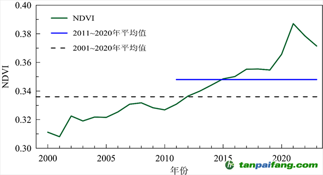 在陸地植被方面,2000年至2023年,中國年平均歸一化植被指數(shù)(NDVI)呈顯著的上升趨勢,全國的植被覆蓋呈現(xiàn)持續(xù)變綠趨勢。2023年,東北地區(qū)東部和西北部、華東地區(qū)東南部、華中地區(qū)東南部和西部、華南、西南大部、青藏地區(qū)東南部年平均NDVI超過0.6,植被覆蓋明顯好于其他地區(qū)。 本*文`內(nèi)/容/來/自:中-國-碳^排-放“交|易^網(wǎng)-tan pai fang . c o m