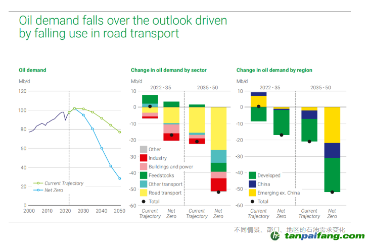 “第三個共同趨勢是全球石油需求都將下降,只是兩種情景的下降速度和程度有巨大區(qū)別,在“當前路徑”下,石油消費量會在2050年降至約每天7,500萬桶的消費的水平,而在“凈零情景”下下降速度更快,到2050年,石油需求將降至每天2,500萬桶到3,000萬桶,比目前的水平降低大概70%。”戴思攀說。 內(nèi).容.來.自:中`國*碳-排*放*交*易^網(wǎng) t a npai fa ng.com
