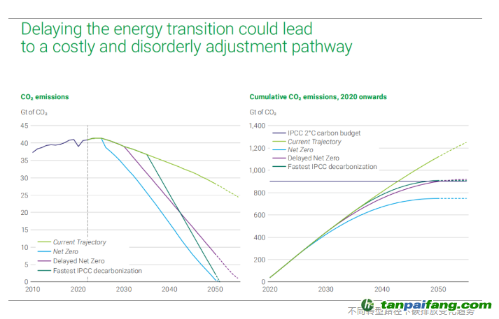 “有序”轉(zhuǎn)型速度如果與凈零情景的去碳速度一致,能源系統(tǒng)可以沿著當前軌跡路徑繼續(xù)運行的最晚日期是在下個十年初,然后轉(zhuǎn)向快速去碳化,符合2°C碳預算,這一“推遲凈零”的路徑(Delayed Net Zero)將在2050年代中期實現(xiàn)凈零排放。