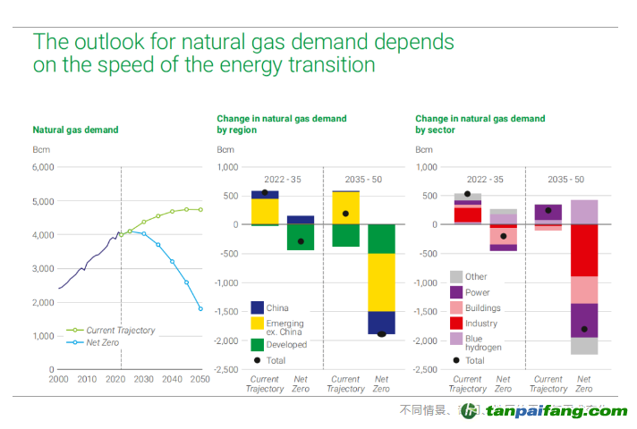 戴思攀說:“對于大多數(shù)燃料我們可以大致預測其消費量變化等,但是對于天然氣甚至無法做出一個大概的判斷,在“當前路徑”之下,天然氣的需求到 2050 年之前都將增長,而在“凈零情景”下,全球天然氣需求會在不久后(2030年前)達峰,到 2050 年降到當前水平的一半左右。” 本`文@內(nèi)-容-來-自;中^國_碳0排0放^交-易=網(wǎng) ta n pa i fa ng . co m