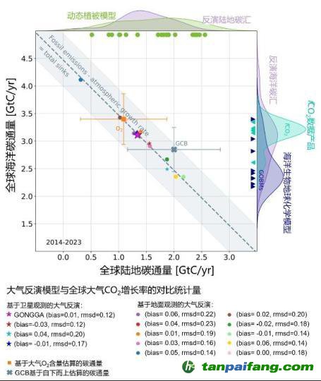 全球陸地與海洋碳匯估算及各大氣反演模型與全球多年大氣二氧化碳增長率的對比統(tǒng)計量示意圖。中國科學院青藏高原研究所 供圖