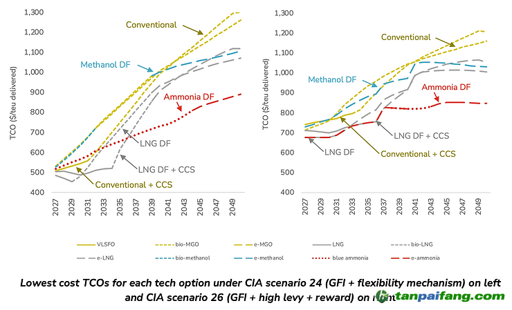 本研究采用總擁有成本 (TCO) 方法,對一艘14,000 TEU集裝箱船使用不同技術和燃料的情況進行建模,以評估國際海事組織目前正在討論的政策組合(包括溫室氣體燃料強度 (GFI) 要求、靈活性機制以及征稅和補貼/獎勵機制)的影響。據(jù)介紹,研究以DNV之前為國際海事組織綜合影響評估所做的建模為基礎,但對生物能源成本和CCS捕集效率進行了更保守的估計。 本/文-內(nèi)/容/來/自:中-國-碳-排-放-網(wǎng)-tan pai fang . com