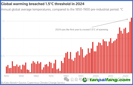 2025年1月10日,世界氣象組織(WMO)根據(jù)六個國際數(shù)據(jù)集證實,2024年是有記錄以來最熱的一年。在過去的十年里,氣溫連續(xù)破紀(jì)錄,也是全球最熱的十年。最為重要的是世界氣象組織(WMO)處理的六個國際數(shù)據(jù)集中,有四個顯示去年全年全球平均氣溫上升超過1.5°C,達(dá)到1.55°C(不確定度范圍為±0.13°C)。2024年全球氣溫首次比工業(yè)化前時代高出1.5°C,使世界更接近違反各國政府在2015年巴黎氣候協(xié)議中做出的承諾。世界氣象組織發(fā)言人克萊爾·努利斯(Clare Nullis)說:“我們看到了異常的陸地、海洋表面溫度和異常的海洋熱量,伴隨著非常極端的天氣,影響了世界上許多國家,摧毀了生命、生計、希望和夢想。”“我們看到了許多氣候變化對海冰冰川退縮的影響。這是非常不正常的一年。” 本*文`內(nèi)/容/來/自:中-國-碳^排-放“交|易^網(wǎng)-tan pai fang . c o m